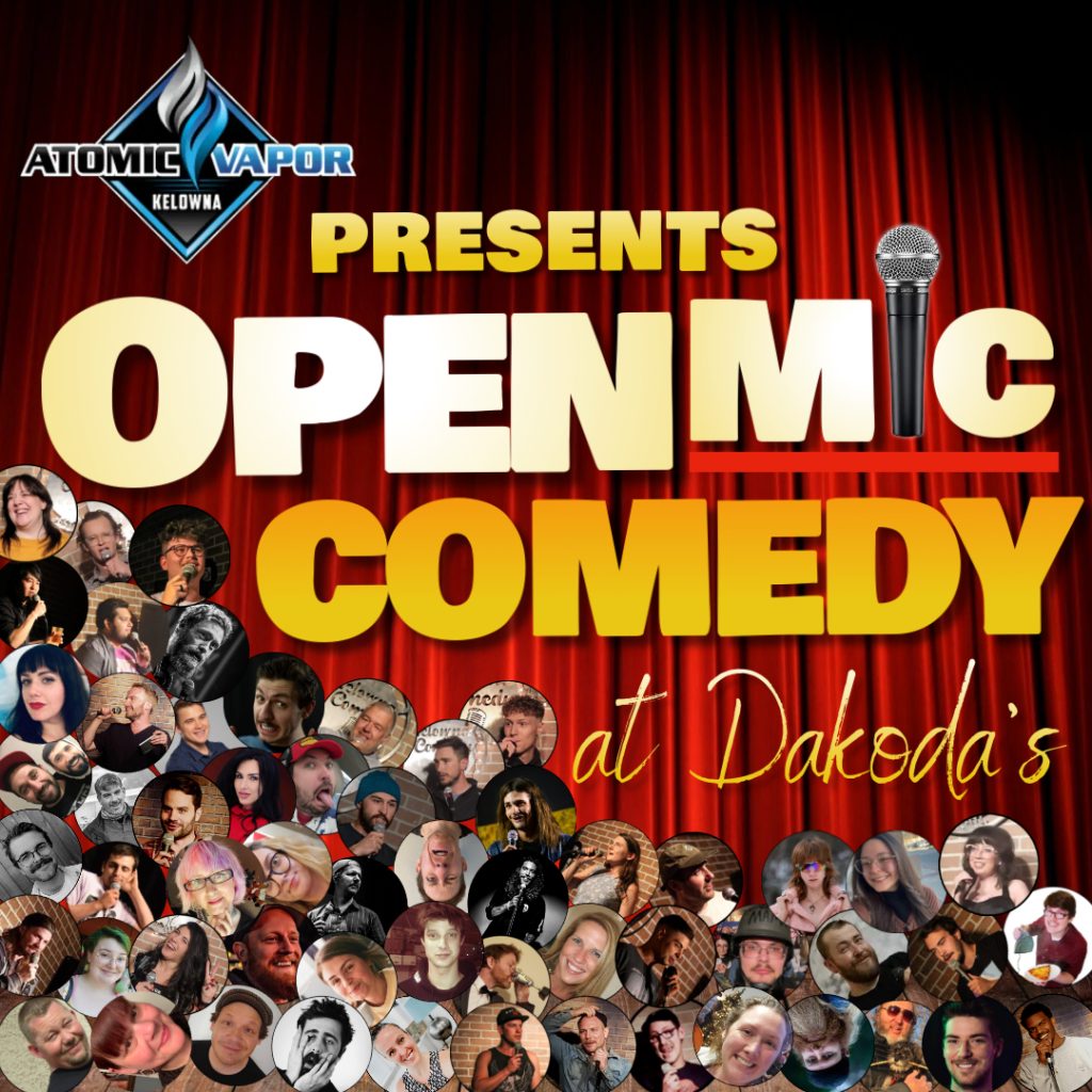 Laugh Out Loud for a Great Cause! Calling all comedy fans! Get ready for a night of side-splitting hilarity at the Open Mic Comedy Night, benefiting the Central Okanagan Food Bank, proudly presented by Atomic Vapor at Dakoda’s Comedy Lounge!