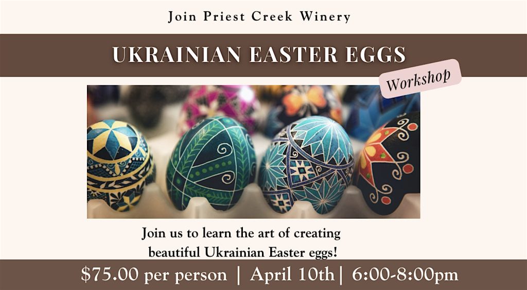 Join us in our cozy wine shop for a 2-hour Ukrainian Easter Egg (Pysanky) workshop led by Patty Presunka, a third-generation Ukrainian-Canadian, while enjoying Priest Creek wine! Please arrive between 5:30 – 6:00 pm for a wine tasting and the class will start at 6 pm.